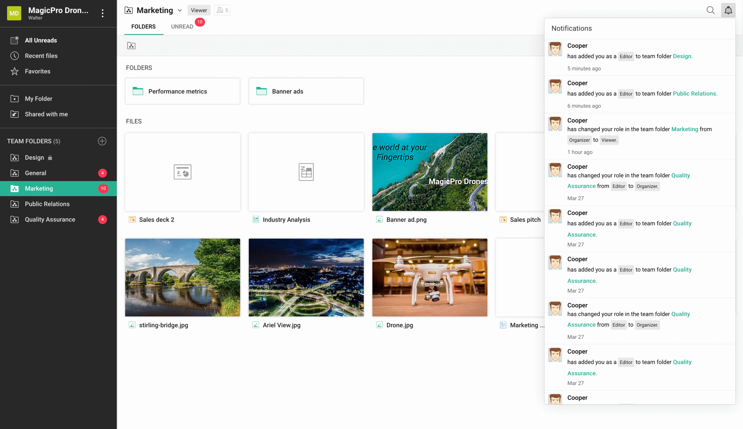 WorkDrive focuses on team-based file management. WorkDrive centralizes documents in “Team Folders,” each with its own set of roles, permissions, and workflows. This helps reduce silos and keeps file ownership transparent and consistent.