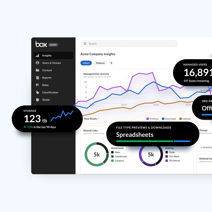 At the infrastructure level, the Box Content Platform is engineered to handle large-scale enterprise workloads, supporting terabytes of data across virtually any file type.
