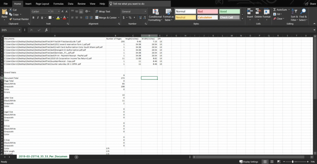 Next, the documents are routed through Dokmee Page Counter to generate precise page counts, analyze dimensions, color schemes, and compression types, and produce detailed reports in Excel or CSV formats. This ensures accurate data for billing, auditing, or storage planning.