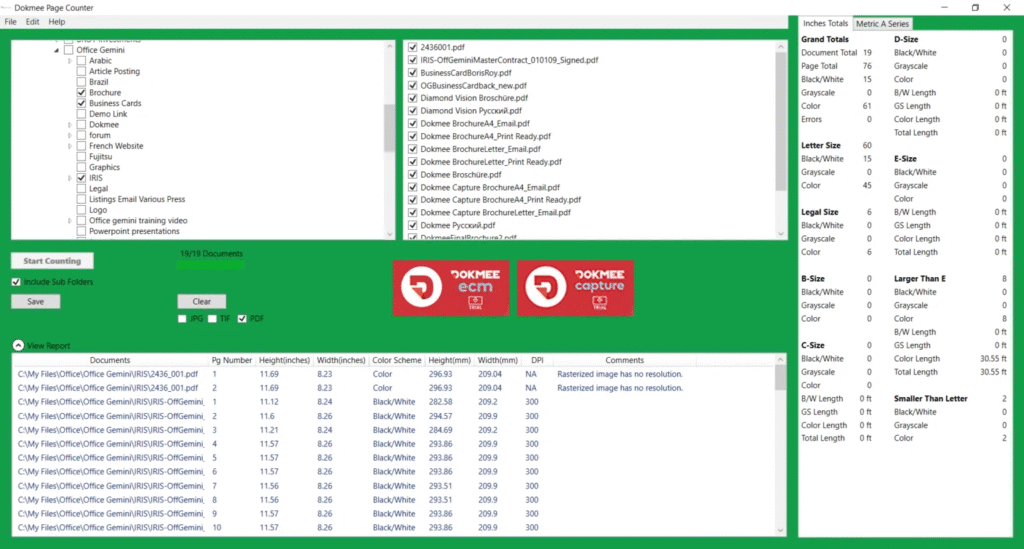 Dokmee Page Counter offers comprehensive reporting capabilities. This feature provides detailed information about each document, such as dimensions, color scheme, compression type, and resolution (DPI).